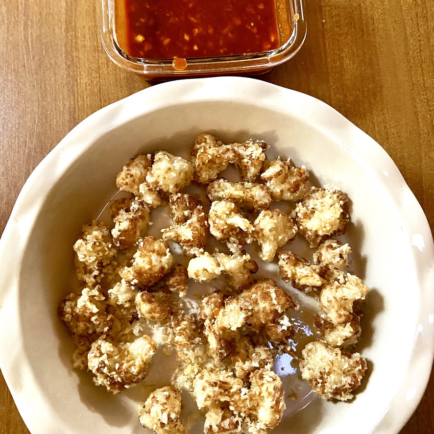My fryer’s first assignment was Fried Cauliflower for our annual Asian Feast. The past two times I’d made this recipe, I had used my dutch oven, a sketchy candy thermometer that didn’t quite fit over the thickish lip of the pot, and my sorely lacking camp-size gas stove. Took ages for the oil to come to temp, and all the while I would attempt to keep the thermometer in the same place as it tried squirting away, and then there was the constant fear that an errant splash of hot oil would ignite the open flame (probably not a real concern, but maybe, and that’s enough for me). But with my deep fryer…peace of mind. It’s all self contained, has a nifty built-in temp control, heats up relatively quickly, and even has a lid to help control the splatter. What satisfaction in scooping out crispy golden cauliflower from the bubbling oil, witnessing its transformation from wet and raw to delicately fried.