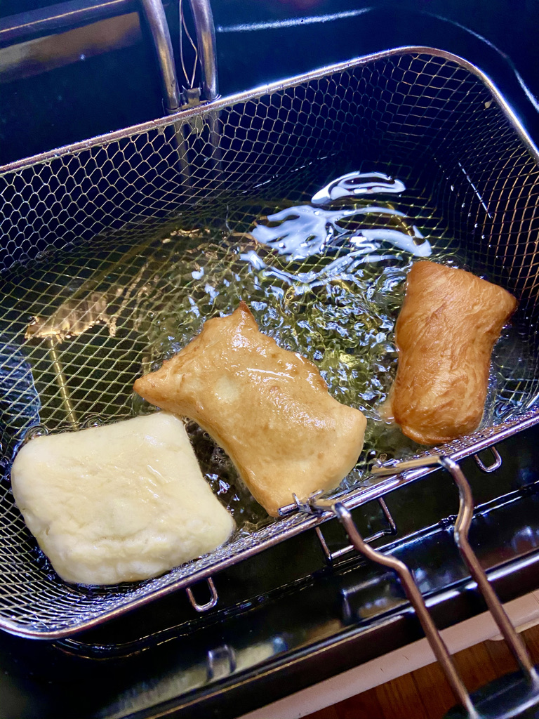 Not that the fryer is without it’s own challenges. The heating element itself seems sort of fragile, and I wonder how long before I twist it the wrong way. The temperature indicator seems to work backward from what I’d expect- the light turning off when it’s done heating up to temp. Logic would then dictate that the light would turn on if the temp drops, but it does not do so. This was made clear during the fryer’s second assignment- Beignets. When the oil was to temp, the little pillows of dough would be surrounded by furious bubbles, and would fry quickly. But then there would be dough that would take many more minutes to fry, and the surrounding bubbles were much less forceful, more mildly upset than furious. Through it all, the temp indicator blissfully indicating nothing, thus forcing me to engage my general cooking intuition (which in the case of frying is nearly 100% informed by what I’ve seen on cooking shows). Seems as though this fryer still needs time for the oil to come back to temp, and is not, alas, the magical contraption I’d imagined, with oil always hot enough for a good, quick fry.